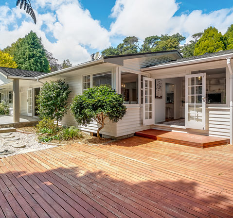 The open-plan kitchen and dining area form the heart of the home, offering practicality and connection for everyday living and entertaining. Nearby, doors open to an expansive deck, creating an ideal setting for hosting, dining outdoors, or simply enjoying the established bush outlook that defines this part of Pinehaven.